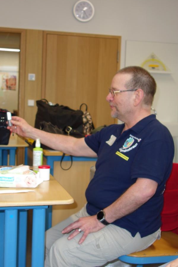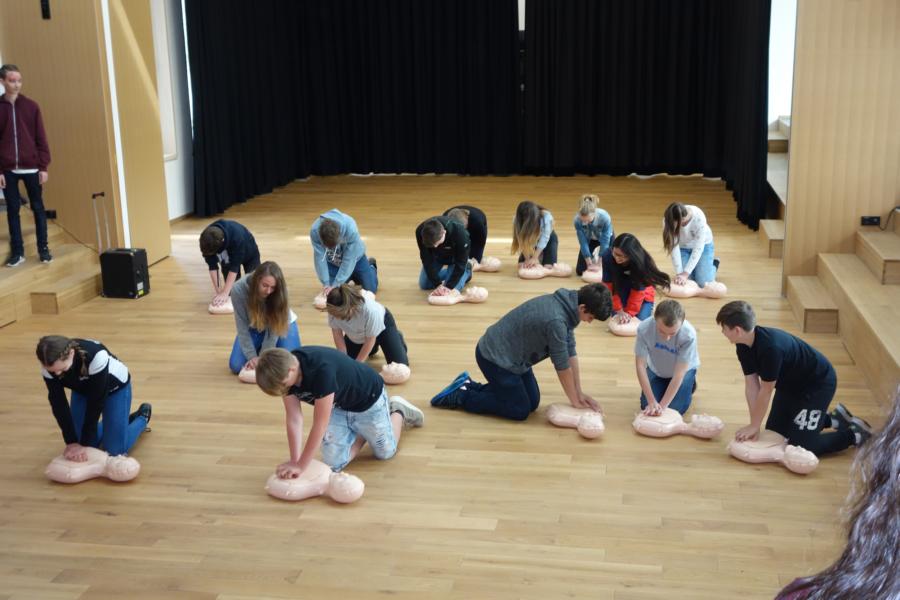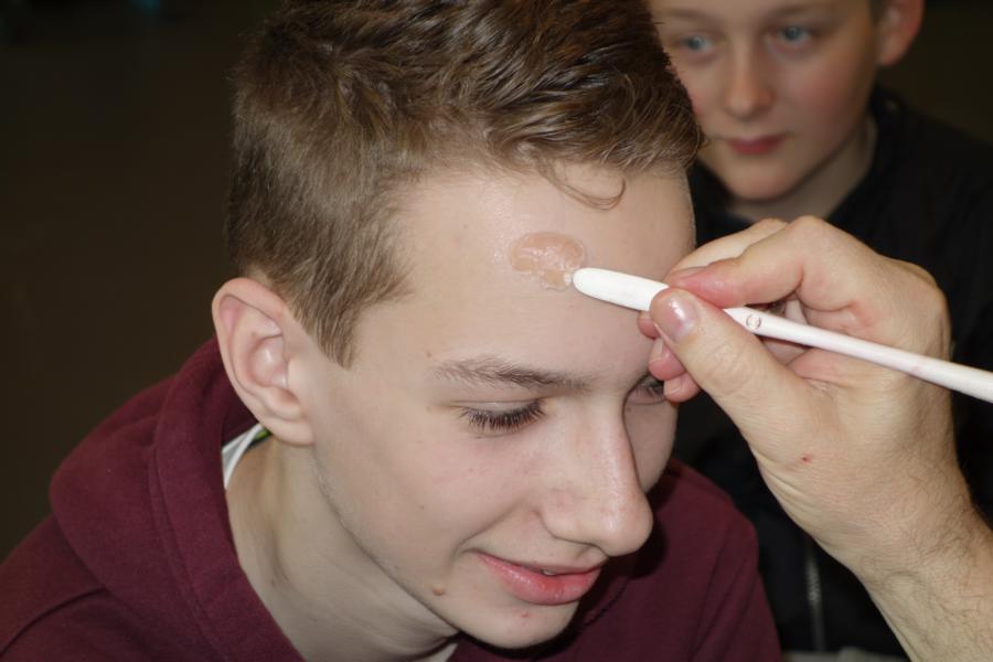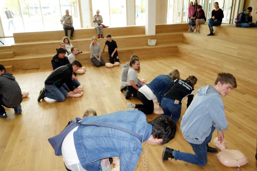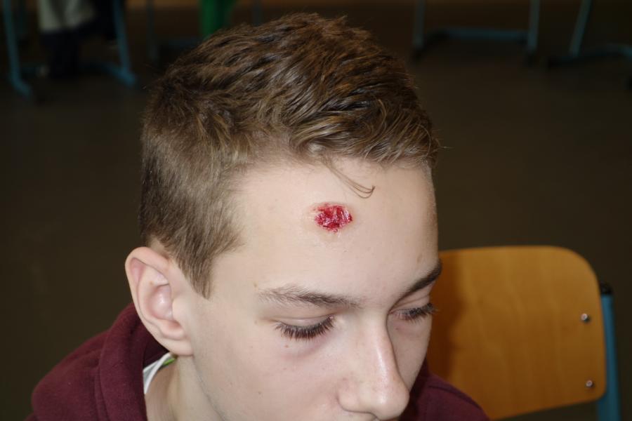 Im Vorfeld des Tages der offenen Tür an der Theodor-Frank Realschule Teningen gelang es Frau Brucker, die Notfalldarsteller des Roten Kreuzes für einen Besuch zu gewinnen. DSC01571Zwei Drittel aller Schulsanis waren gekommen um realistische Verletzungen geschminkt zu bekommen. In drei Gruppen wurden sodann verletzte Personen im Außenbreich der Schule gefunden und versorgt. Eine letzte Darstellung galt der Wiederbelebung (Reanimation) an Dummies. Auch Erwachsene durften ihre praktischen Kenntnisse in der Reanimation auffrischen.
