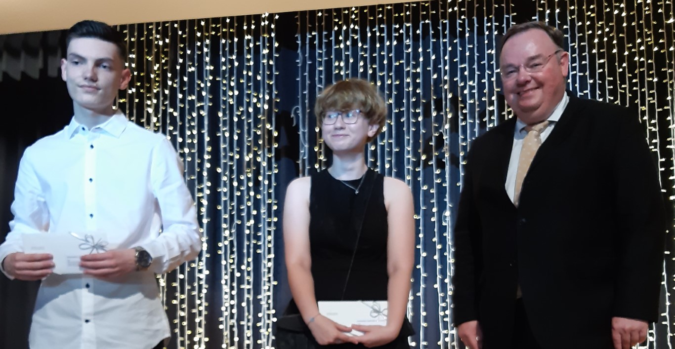 Abb. 02: Den Bürgermeisterpreis für den besten Hauptschulabschluss erhielt: Kim Sobczyk (Mitte) für den besten Werkrealschulabschluss: Mauro Di Federico (links), überreicht von Bürgermeister Heinz-Rudolf Hagenacker (rechts)
